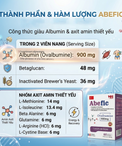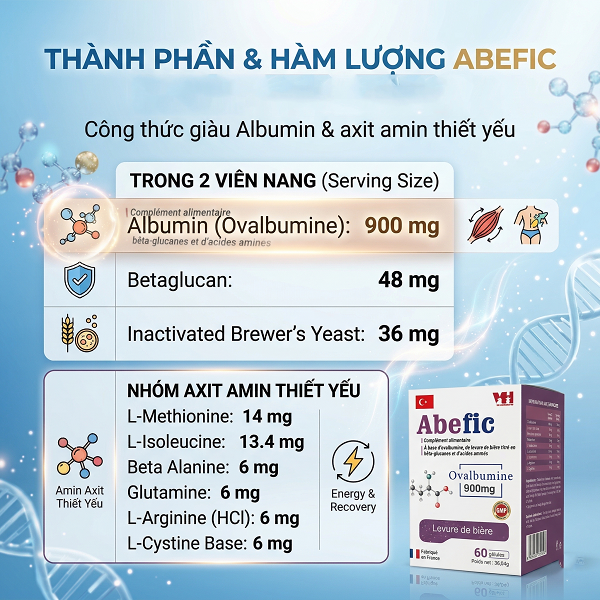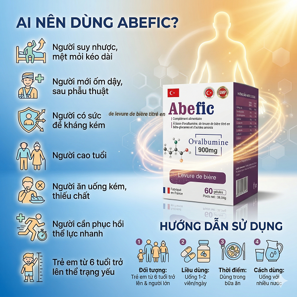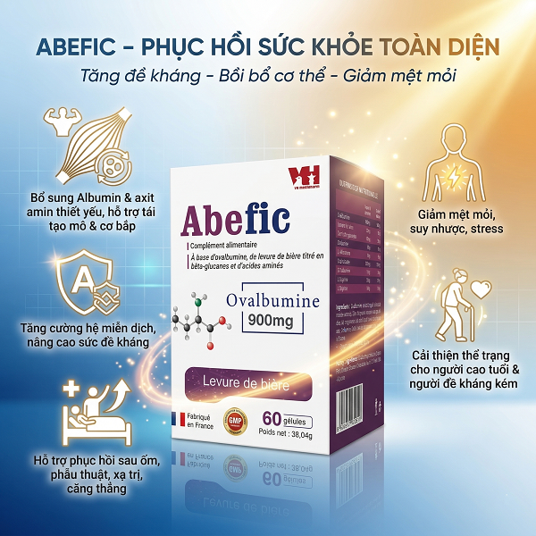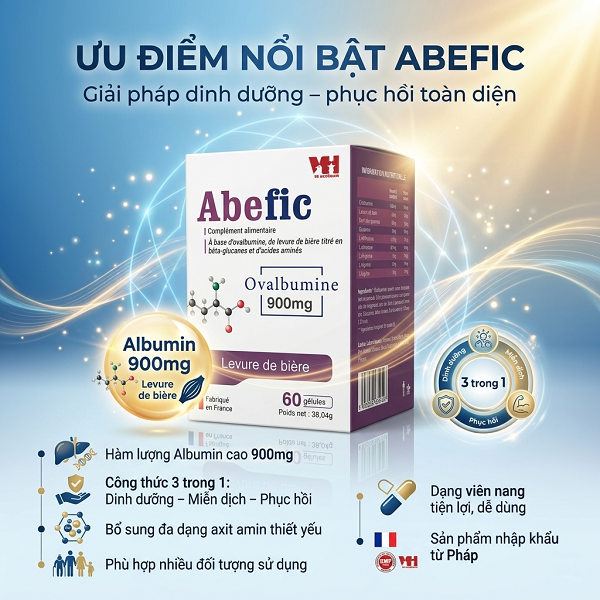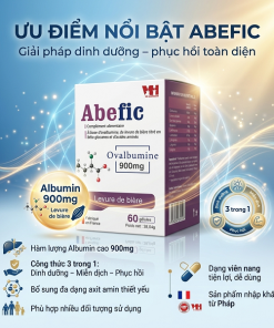 Abefic là thực phẩm bảo vệ sức khỏe nhập khẩu từ Pháp, chứa Albumin (Ovalbumine) kết hợp Beta glucan và các axit amin thiết yếu, giúp hỗ trợ tăng cường miễn dịch, phục hồi cơ thể và cải thiện thể trạng cho nhiều đối tượng.
