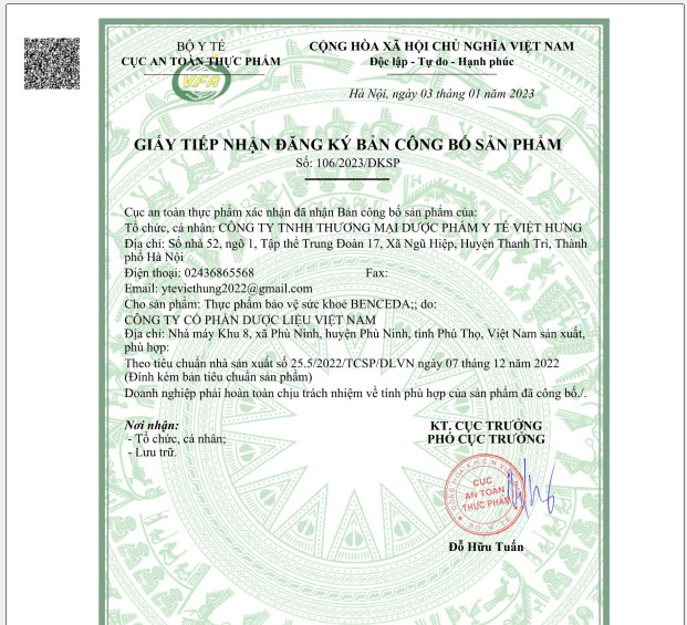 Số Giấy tiếp nhận đăng ký bản công bố sản phẩm: 106/2023/ĐKSP