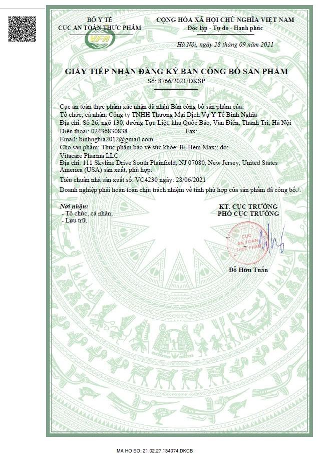 Bi-Hem Max sản phẩm đã được đăng ký bản quyền về thương hiệu giữa các nhà khoa học của hãng Vitacare Pharma, LLC, U.S.A và nhà phân phối BNC Medipharm. Bi- Hem Max đã được Bộ Y Tế cấp phép cho Công Ty TNHH TM DV Y Tế Bình Nghĩa nhập khẩu theo Giấy Tiếp Nhận Đăng Ký Bản Công Bố Sản Phẩm số: 8766/2021/ĐKSP, cấp ngày 28/09/2021 và phân phối độc quyền tại Việt Nam.